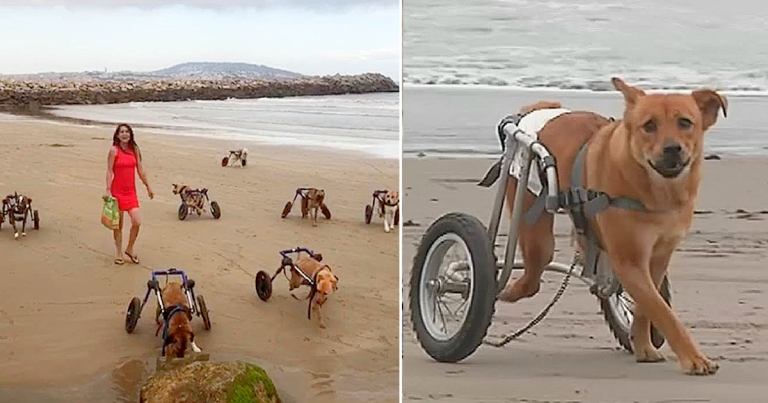 For people relaxing on the beach nearby, the moment was surprising and uplifting. Seeing a group of wheelchair-assisted dogs racing happily across the shoreline was both unusual and inspiring.