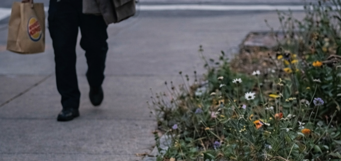 Amid this familiar routine, one small corner of the sidewalk told a very different story. There, resting on a simple piece of cardboard, a homeless man lay asleep near a modest patch of wildflowers that had grown through cracks in the pavement.