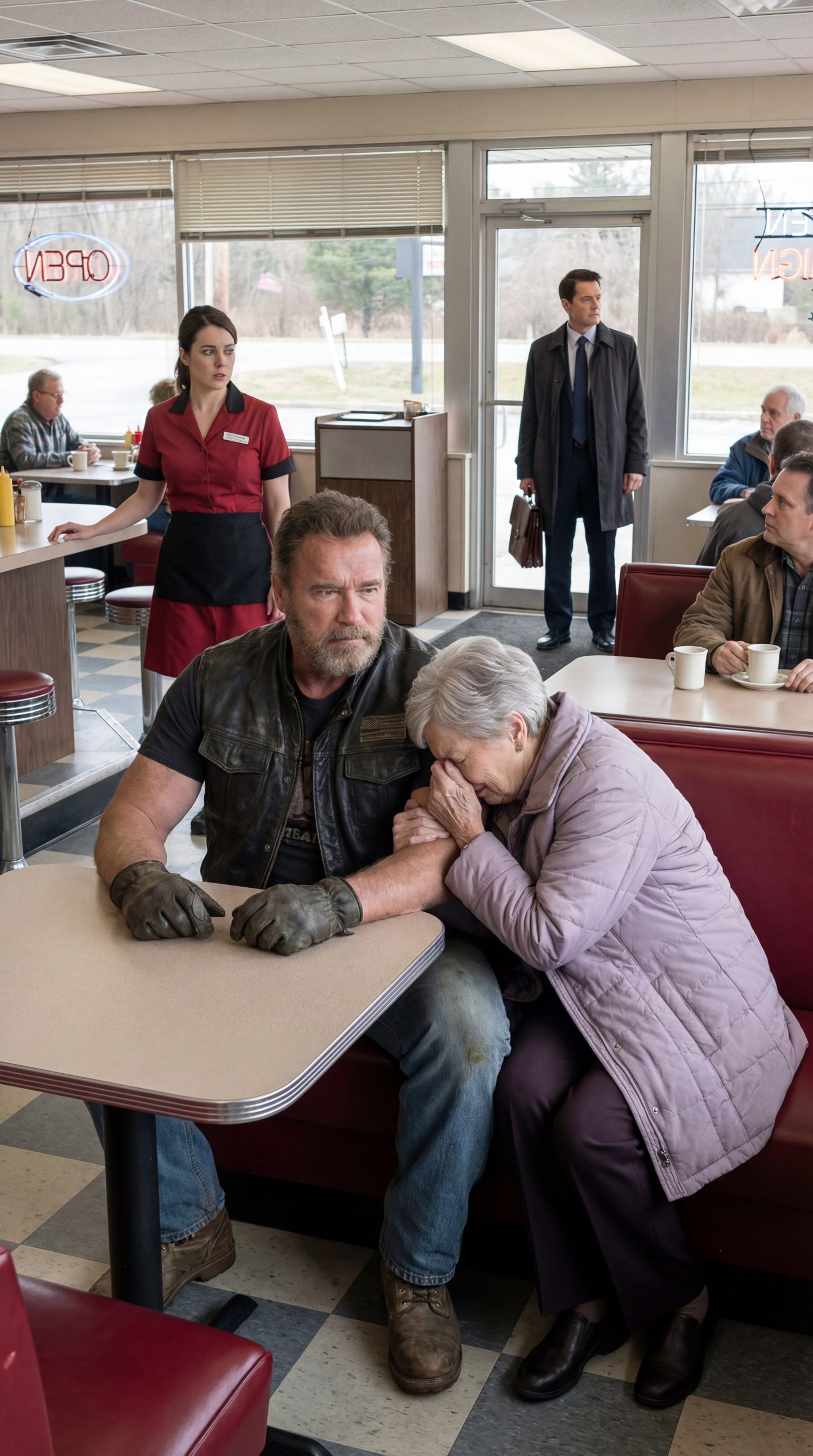 Then headlights swept across the diner windows from outside. The woman’s hand tightened on his sleeve.