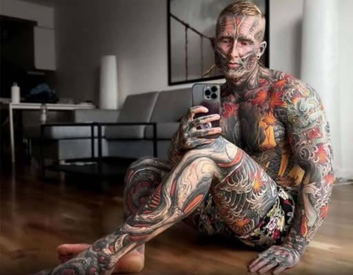 As a tattoo apprentice, he has covered nearly all of his body with tattoos, creating a striking and highly visible form of personal expression.