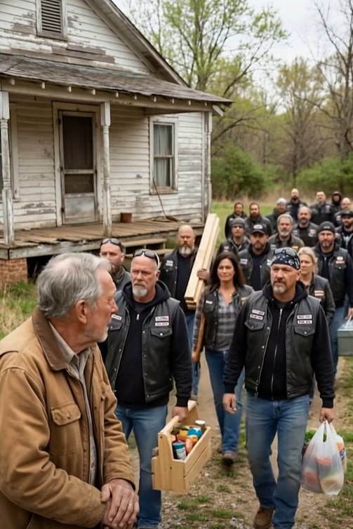 Within an hour, the quiet street transformed. Motorcycles arrived one after another. Friends of Reed came carrying tools, supplies, and more groceries.