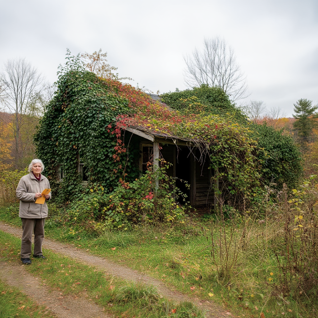 Standing there, she saw it clearly for the first time—a small wooden hut, nearly hidden beneath thick vines that had grown over its walls and roof.