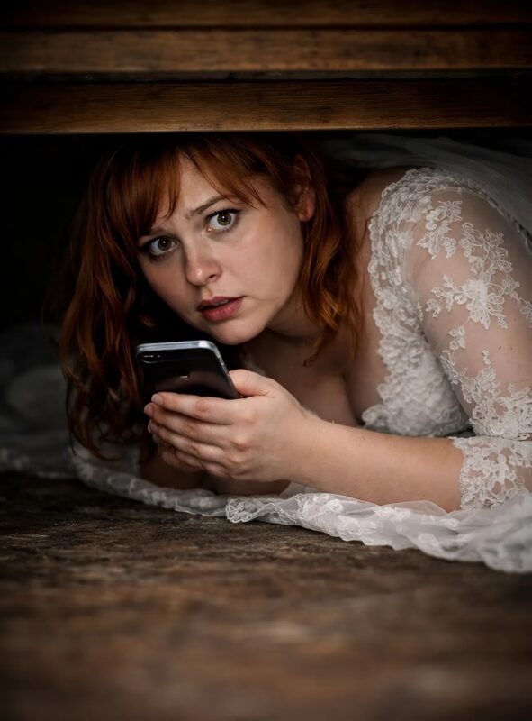 The room was quiet, and she carefully positioned herself beneath the bed, trying not to disturb anything. Her wedding dress spread awkwardly around her, its delicate fabric catching on the carpet and edges of the bed frame.