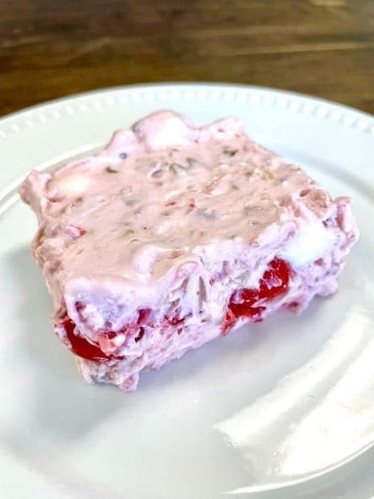 The preparation process is uncomplicated. The cream cheese and sugar are beaten until smooth, the fruit is folded in, the whipped topping is added carefully, and the mixture is frozen until firm.