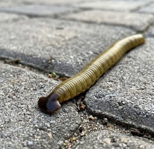 It can be surprising to notice a long, flat worm moving slowly across a patio, garden, or walkway.
